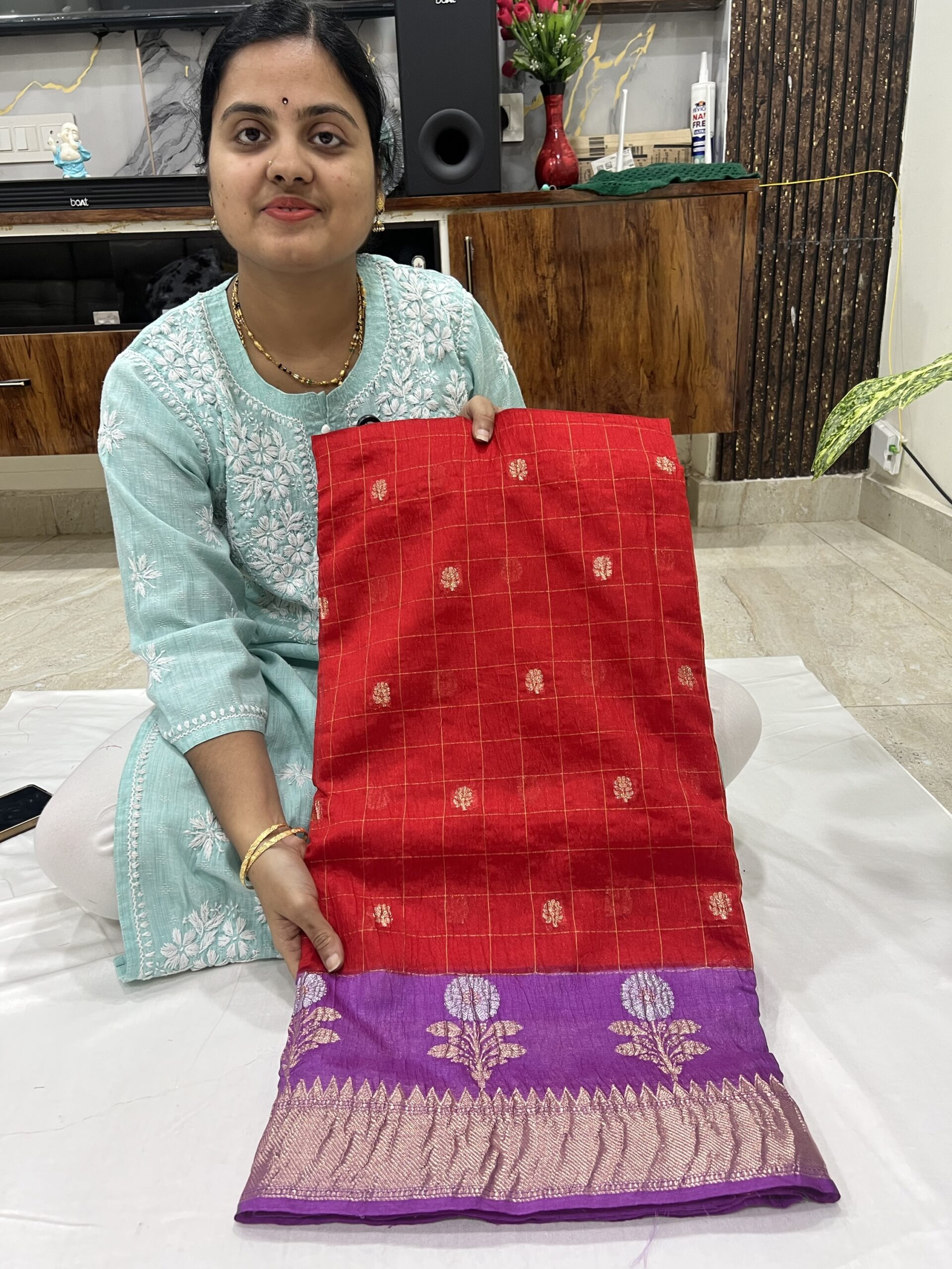 Banaras crushed sarees with checks and temple borders