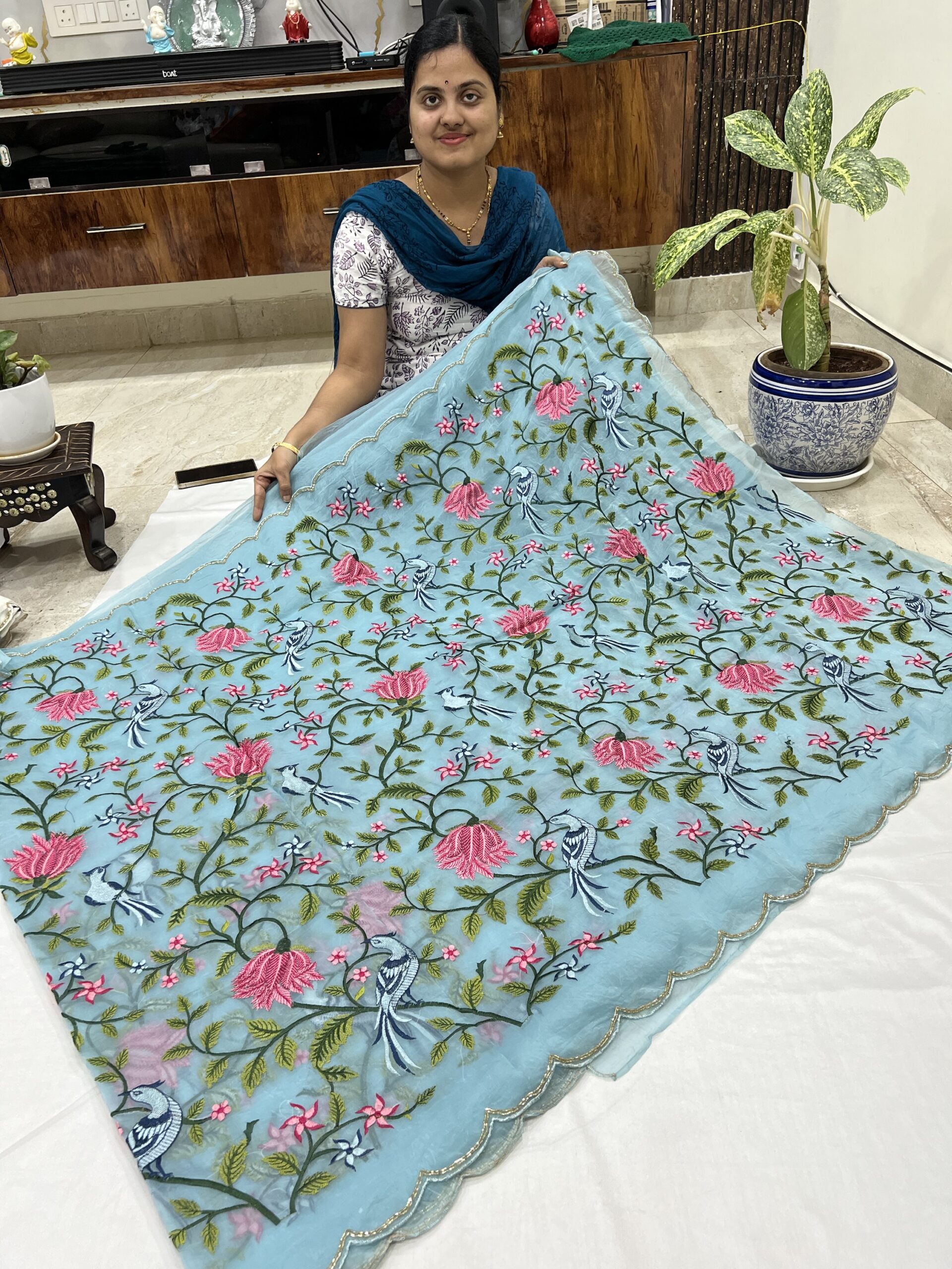 Designer organza embroidery work sarees with scallop finish borders