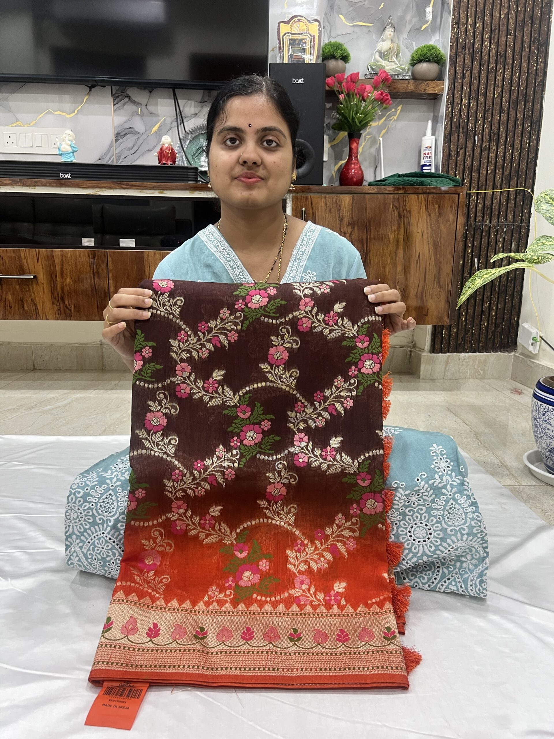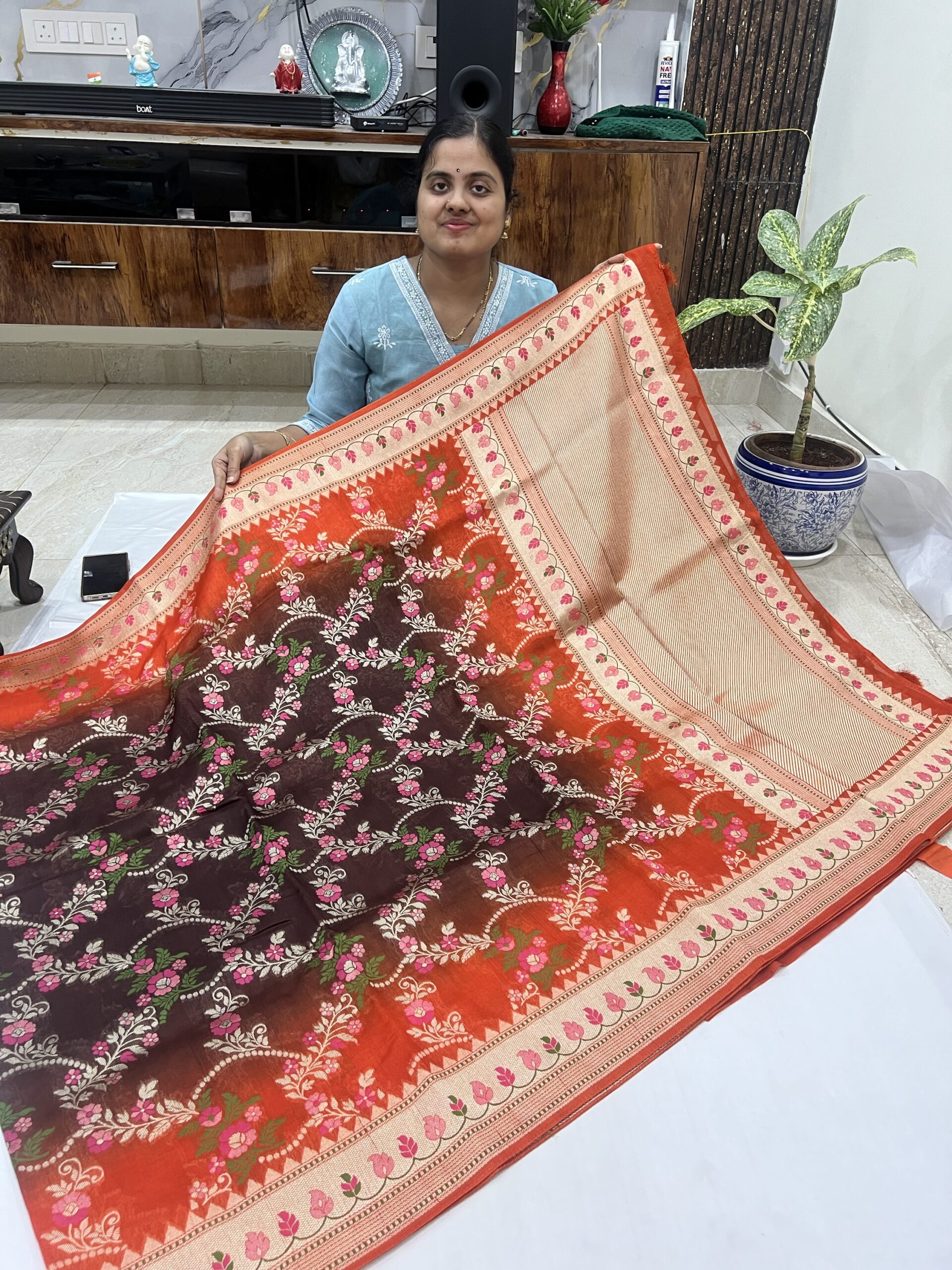 Trending rust orange and brown Munga Tussar georgette sarees with Meena borders